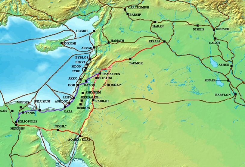 The modern name for this area is the Jordanian Highlands. The Kings Highway, which today runs from near Irbid in the north to Petra in the south, is over 5,000 years old. Abraham used it in his journey to the land Yehovah promised him. Trade caravans, the Nabateans, and Romans, all traveled along this ancient road that ran from Heliopolis, Egypt, eastward across the Sinai Peninsula to Eilat and Aqaba. It turned north there past Petra and Shaubak (Shobak), Rabbah, Madaba, Amman (biblical Philadelphia), and Damascus, ending at Resafa on the upper Euphrates.[1] See the red road marked on the map below.