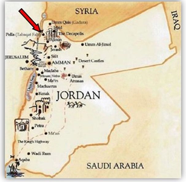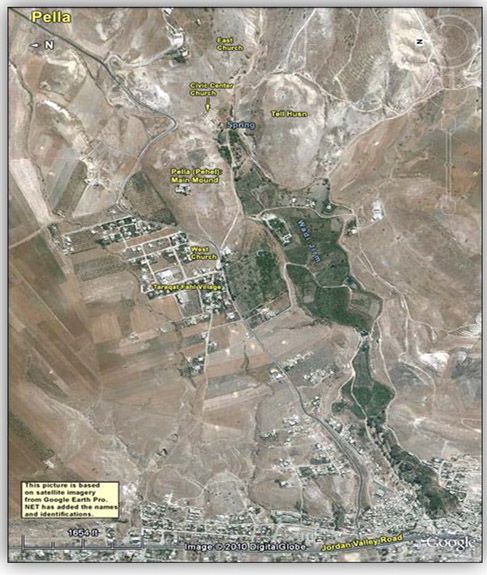 The site of ancient Pella lies in the modern country of Jordan, about two and a half miles east of the Jordan River and seventeen miles south of the Sea of Galilee.
