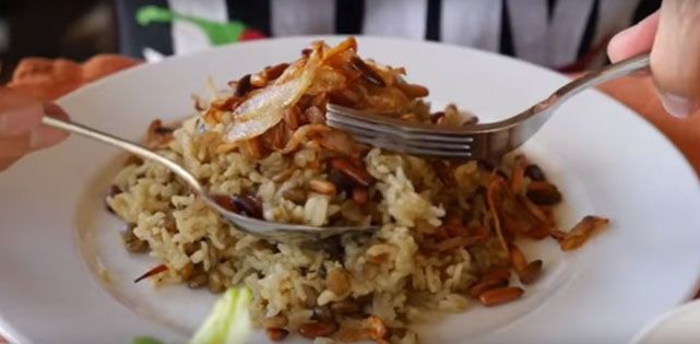 This is a healthy, protein-heavy dish which comes together quickly. Dump rice and lentils into a big pot. As usually, it is seasoned with generous doses of cumin and other spices. A pile of onions are caramelized while it cooks and are placed atop the mound of food after it is served on a plate. Yogurt or salad are side dishes.