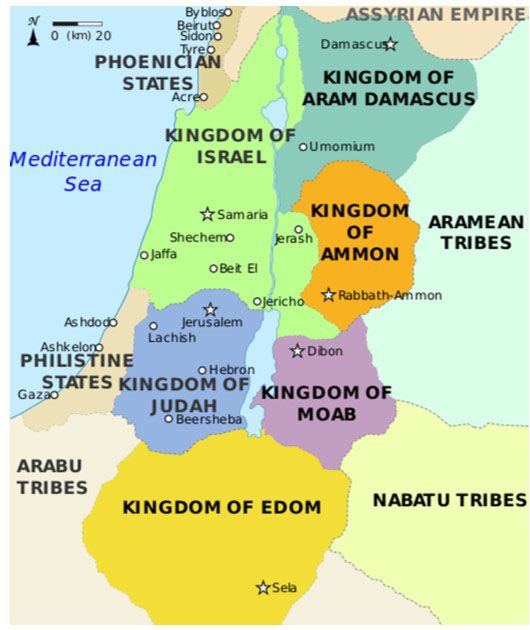 The term is often used in reference to the ancient lands in the Old Testament of the Bible (Bronze Age): the kingdoms of Israel, Ammon, Moab, Judah, Edom, and Aram; and the Phoenician and Philistine states. Important cities include Jerusalem, Jericho, Petra, Beersheba, Rabbath-Ammon, Ashkelon, Tyre, and Damascus. [5]
