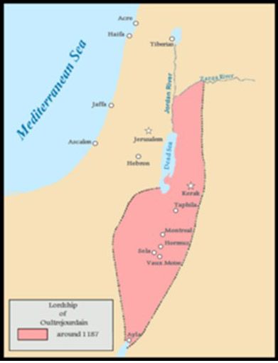 Perhaps a better term would be “Principality of Jordan.” It had to do with this loosely define area under the control of Baldwin I. Few Christians lived here. Mostly populated with Shia Bedouin, everyone was assessed tax. Like everything else, this was all about money. Jordan was in the spice caravan trade routes, and there was money to be made by taxing all the goods that came through.