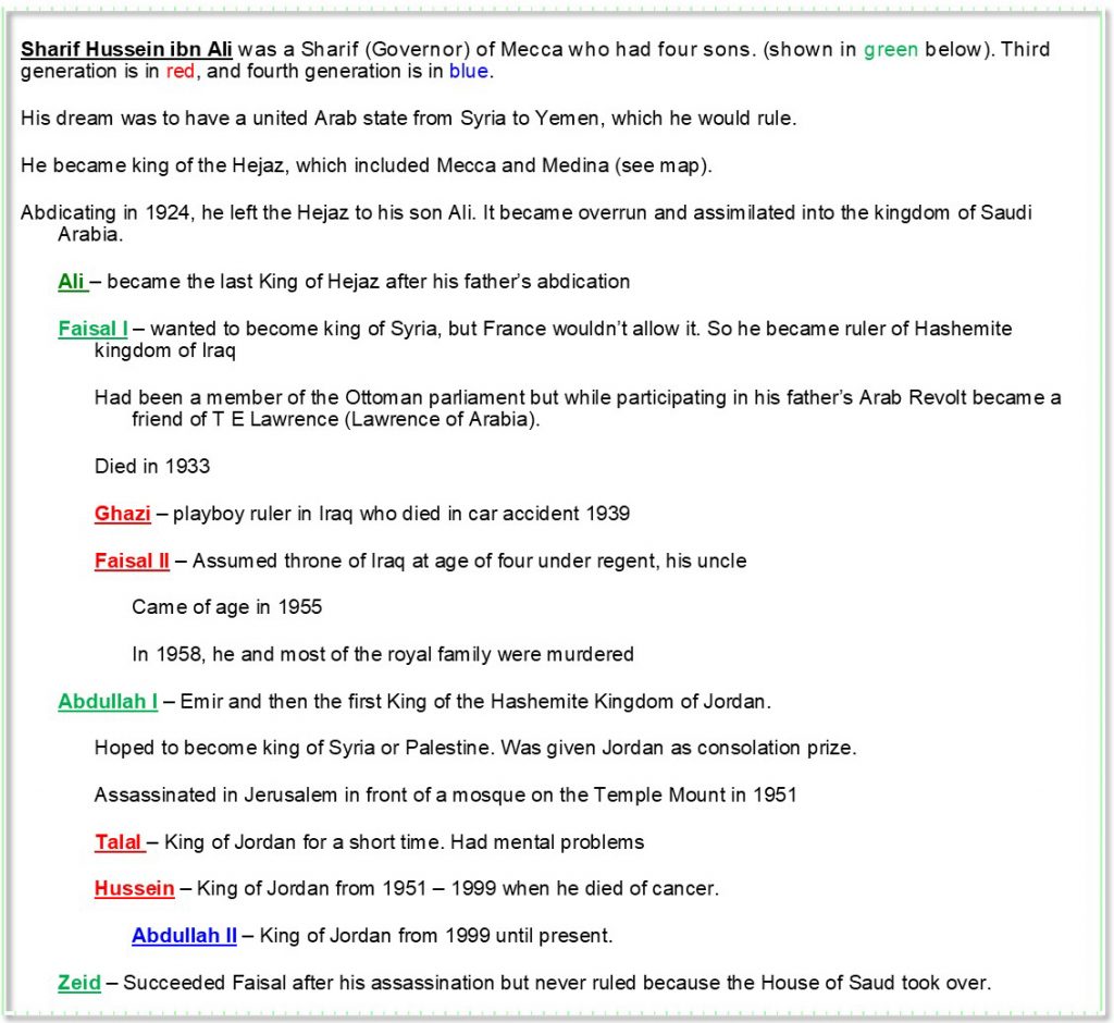 Faisal I, the son of Sharif Hussein, wanted to rule Syria, but the French would not allow it. So he was given Iraq to rule. Rulers had been doled out to all the countries in the Middle East, and nothing was left for Abdullah I except for a piece of real estate no one wanted—Transjordan, the area east of the Jordan River and the then-named Palestine. In frustration and hatred toward the French who had control over the land the Hashemites were supposed to have, Abdullah put together a small force of tribal Arabs and threatened to carry out raids against them. In an effort to contain the situation, Winston Churchill himself met with Abdullah in Jerusalem and installed him as King of Jordan. In effect, you could say Churchill created Jordan.[4]